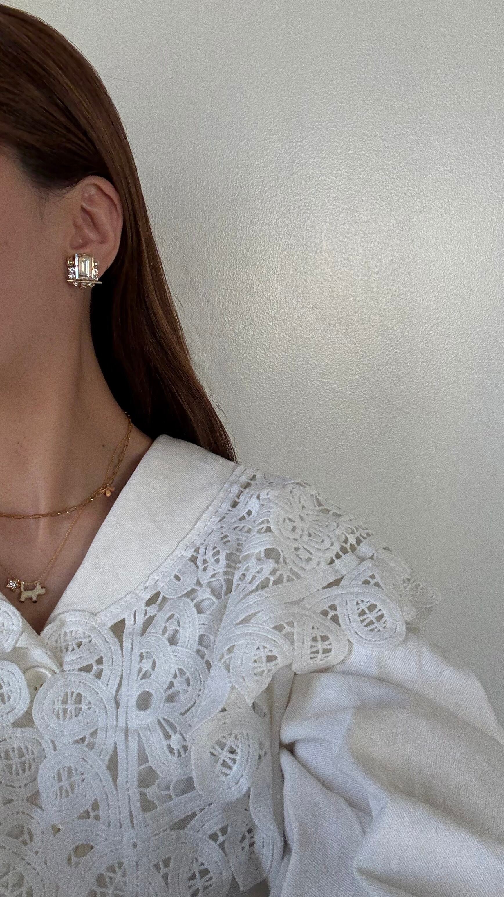 長さはチョーカーなどのネックレスの重ね合わせが可愛くなるような長さにしています。