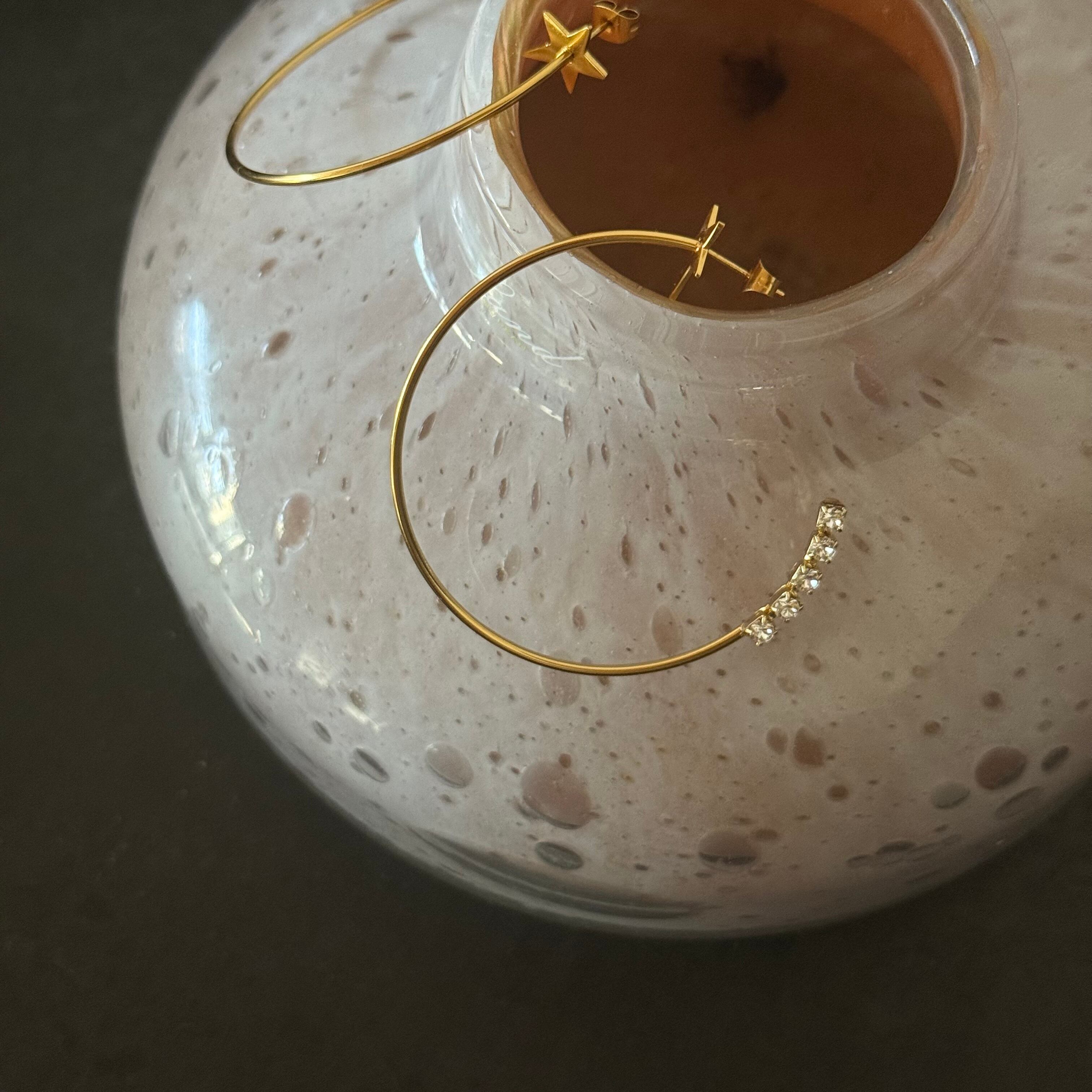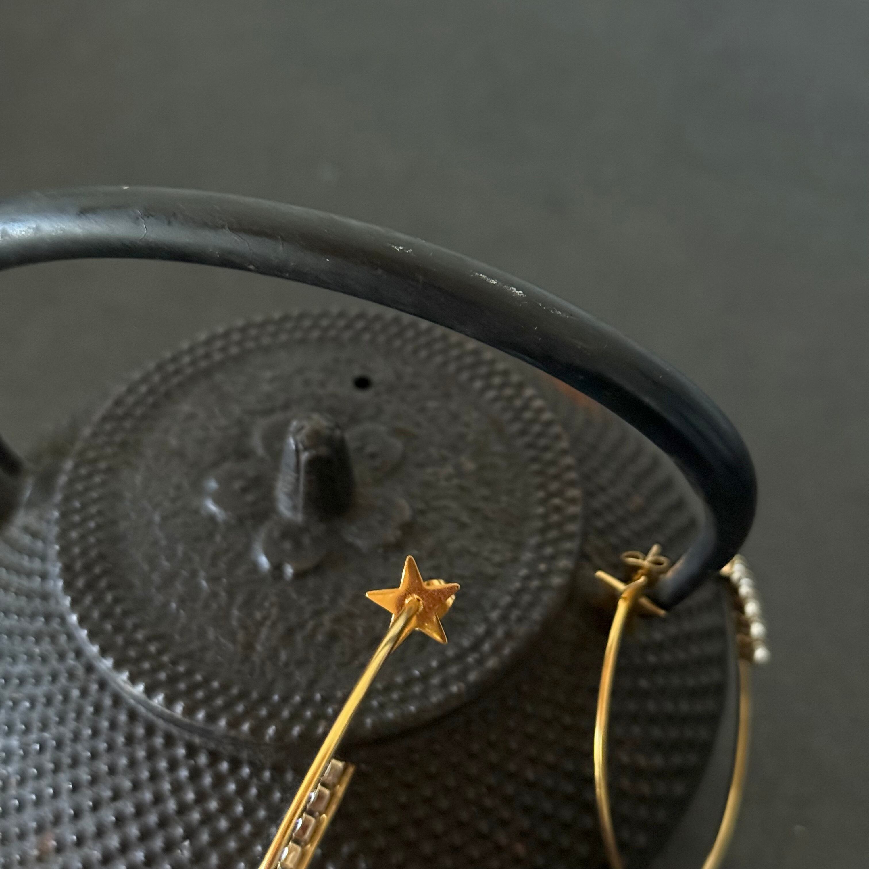 耳たぶに寄り添う星のトップから流れるように弧を描くフープピアス。